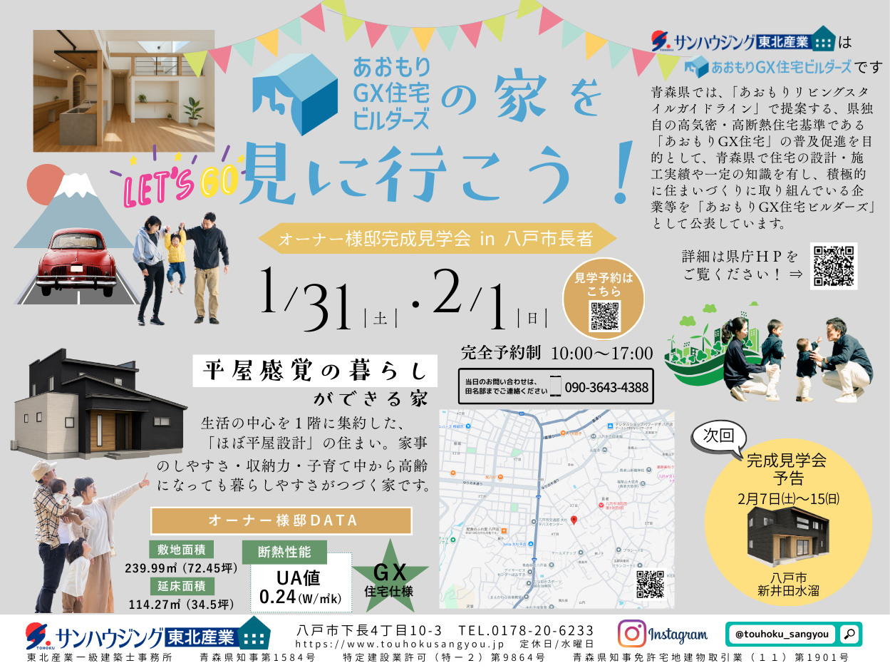 生活の中心を1階に集約した、「ほぼ平屋設計」の住まい。家事のしやすさ・収納力・子育て中から高齢になっても暮らしやすさがつづく家です。「あおもりGX住宅ビルダーズ」の家を見に行こう!